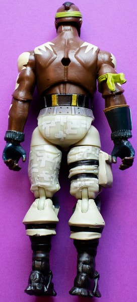 Bandolier has 28 points of articulation. The head, chest, and left thigh are original to this figure. The arms, lower torso, waist, lower right leg, and lower left leg are shared between Bandolier, Jonesy, Rex, and Rust Lord. The upper right leg is shared between Bandolier, Jonesy, and Rex.